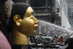 protests_044A statue and a torn Thai national flag remain in front of Bangkok's Central World shopping mall, which was gutted by fire after army soldiers advanced towards an encampment of thousands of Red Shirt protesters, May 19, 2010. (REUTERS/Adrees Latif)