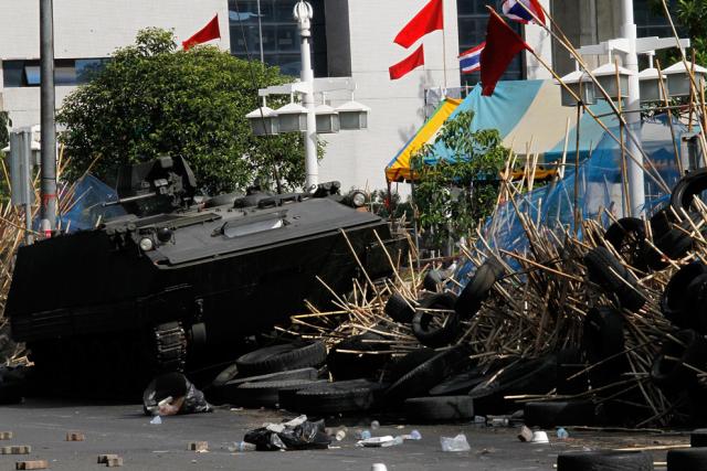 protests_031An armored vehicle breaks through a Red Shirt barricade on Wednesday May 19, 2010 in Bangkok, Thailand. (AP Photo/Vincent Yu)