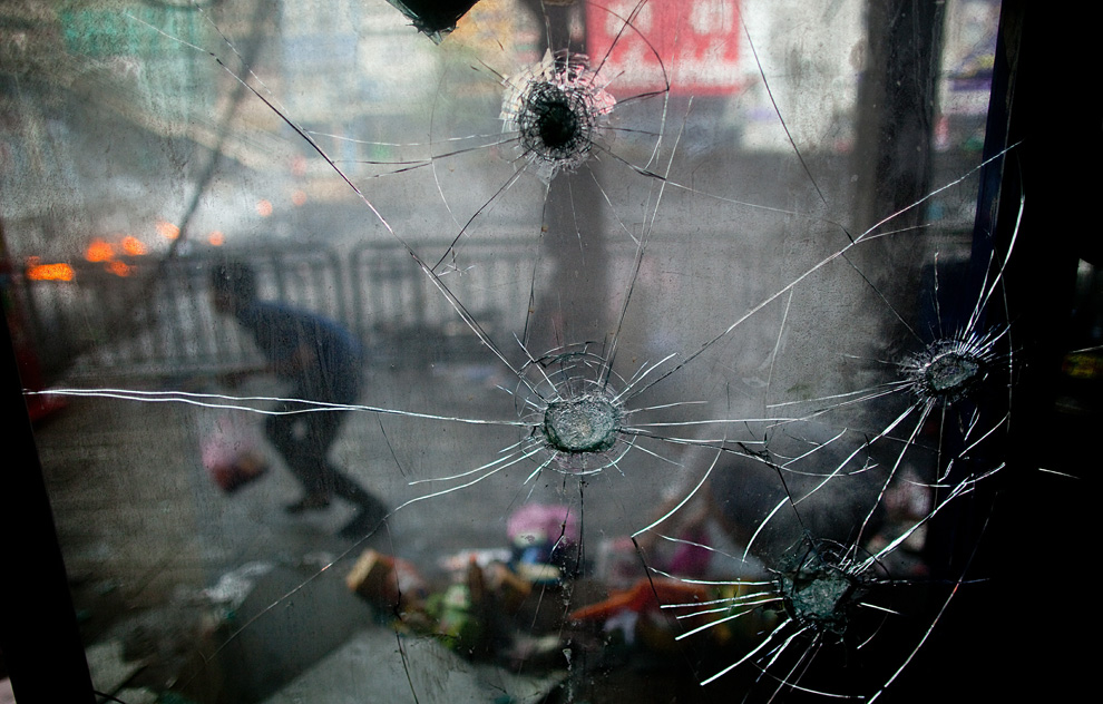 protests_022A broken window in a burned out shop is seen as a Red Shirt protester runs by as violence continues on May 16, 2010 in Bangkok, Thailand. (Paula Bronstein/Getty Images)