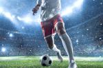 soccer_67male soccer, football player practicing, attacking, kicking ball at sport match on sky background at stadium with flashlights. sport competition. action, motion, energy and dynamic concept.