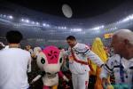Chinese entertainers photoed with Fu Niu Lele during the closing ceremony of the 2008 Beijing Paralympic Games at the National Stadium on September 17, 2008 in Beijing, China.