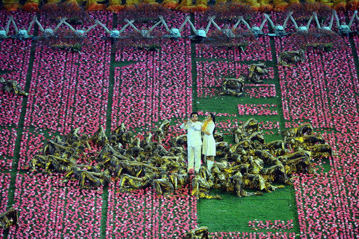 Chinese entertainers perform during the closing ceremony of the 2008 Beijing Paralympic Games at the National Stadium on September 17, 2008 in Bei