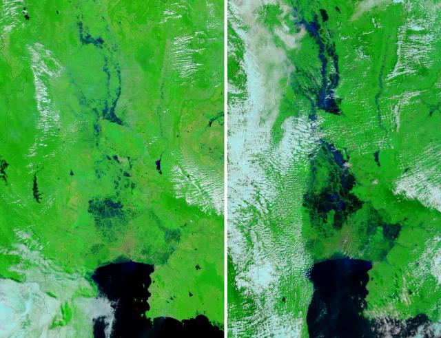 This pair of photographs from NASA shows images from space of the Bangkok metropolitan area (lower center) taken by the Terra satellite on November 12, 2008 (left) and the same area on October 19, 2011, illustrating the flood surge north of the city. (NASA/AFP/Getty Images)