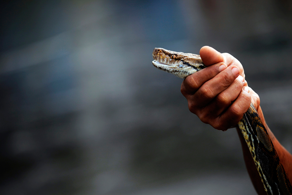 thai_flood_54_028Motorcycle taxi driver Chatchawal Phuengwut holds a python he caught in floodwaters just outside the Grand Palace in Bangkok October 28, 2011. (Damir Sagolj/Reuters)