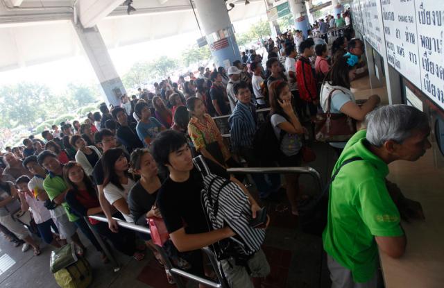 thai_flood_54_034People queue to buy bus tickets to leave the Thai capital at a bus terminal in Bangkok October 27, 2011. (Kerek Wongsa/Reuters)