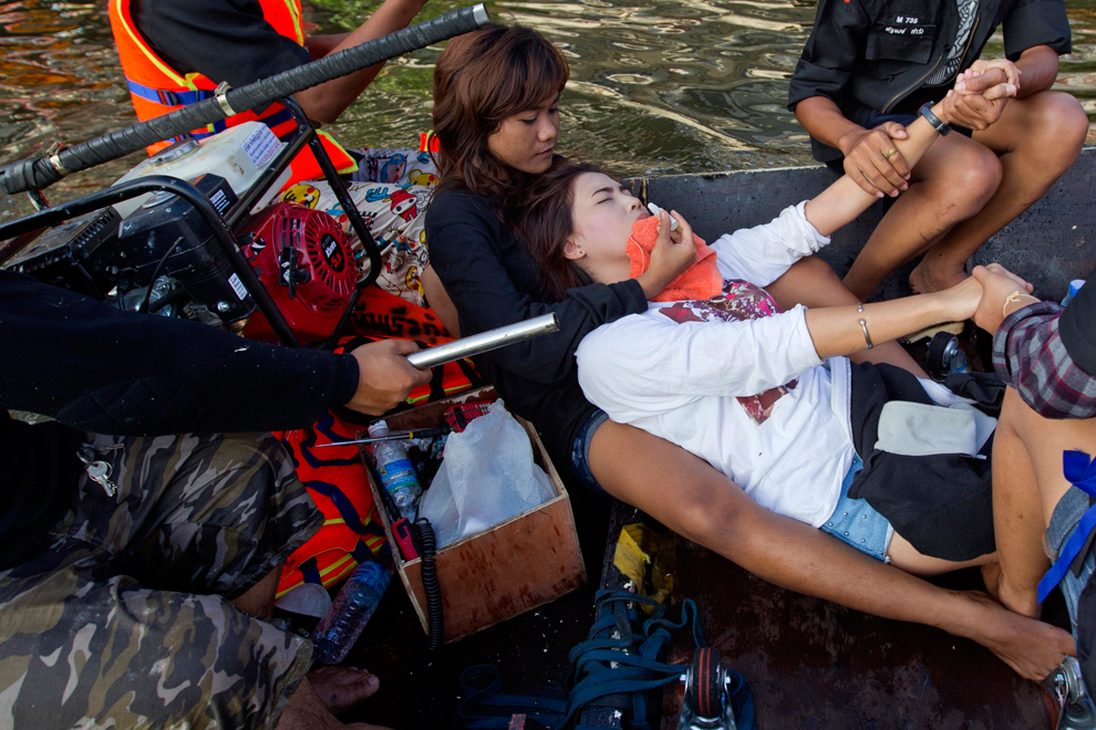 thai_flood_54_039A woman in need of medical attention is evacuated by boat from the flood waters in Bangkok's Bang Phlat district October 30, 2011. (Adrees Latif/Reuters)