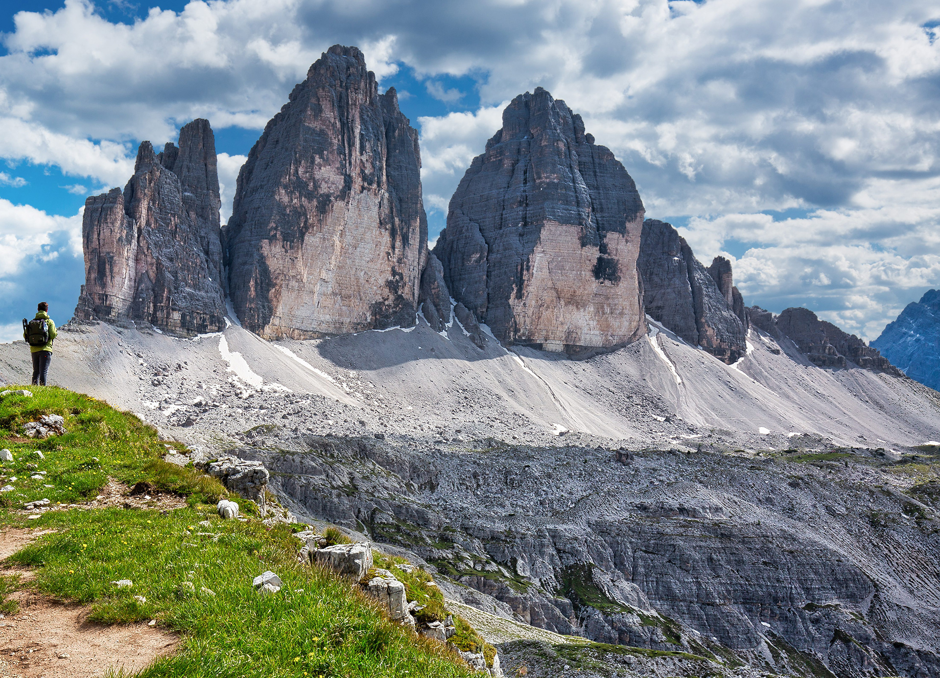 Tre Cime as seen from the foot of Torre di Toblin mountain