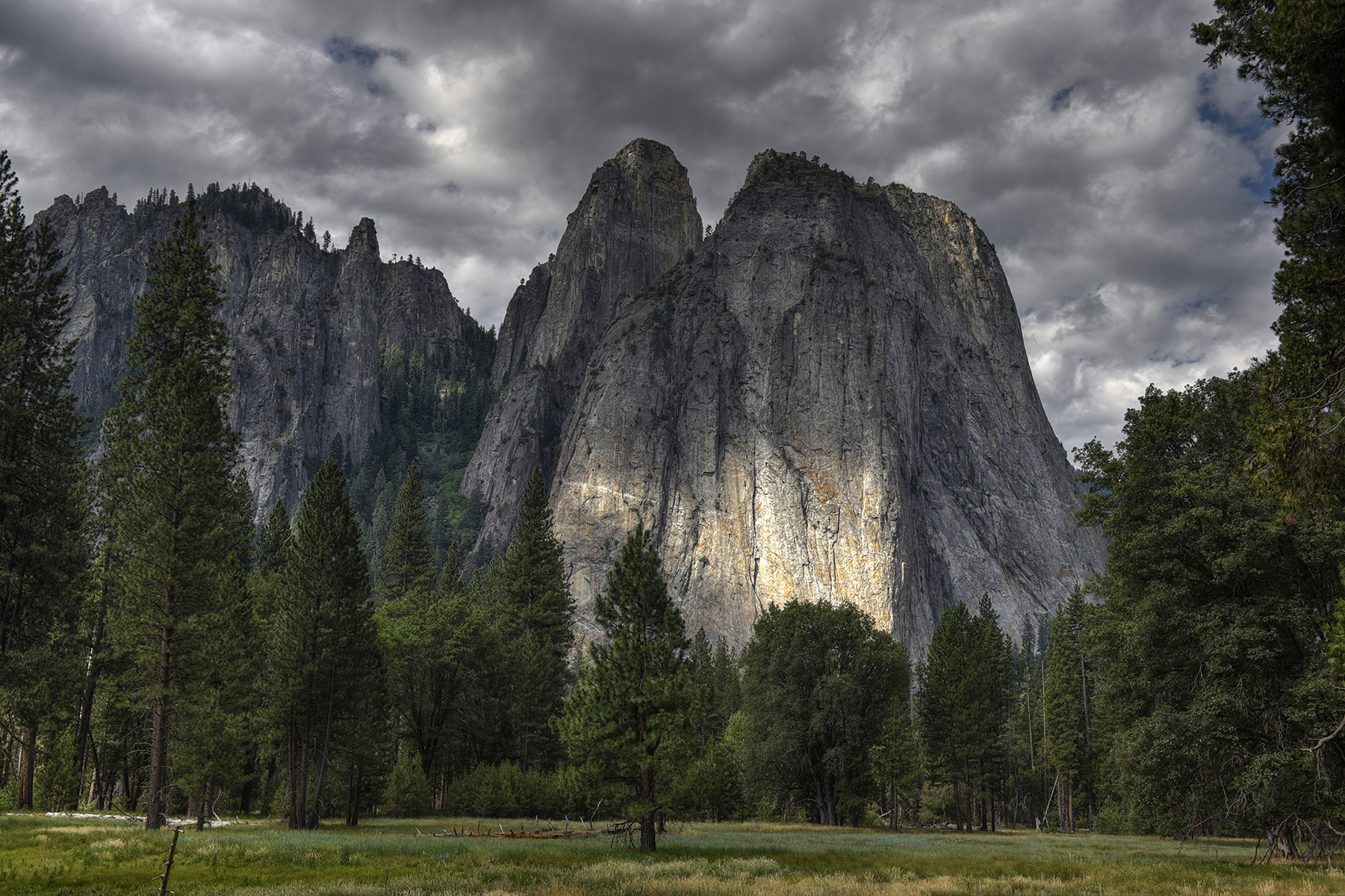 Tre Cime as seen from the foot of Torre di Toblin mountain